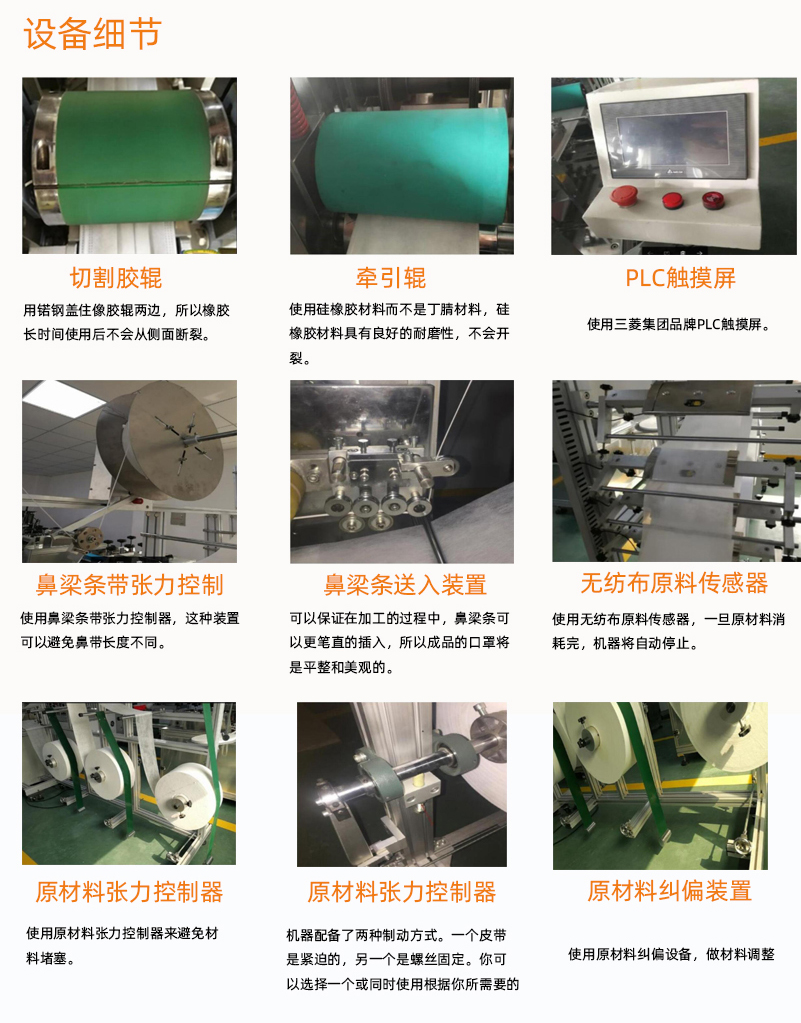 4、全自動外耳帶電焊機同時制作口罩片材和外部耳焊點部分,可節省勞動,一旦無紡布原材料在使用的過程中使用完,機器會自動停止。