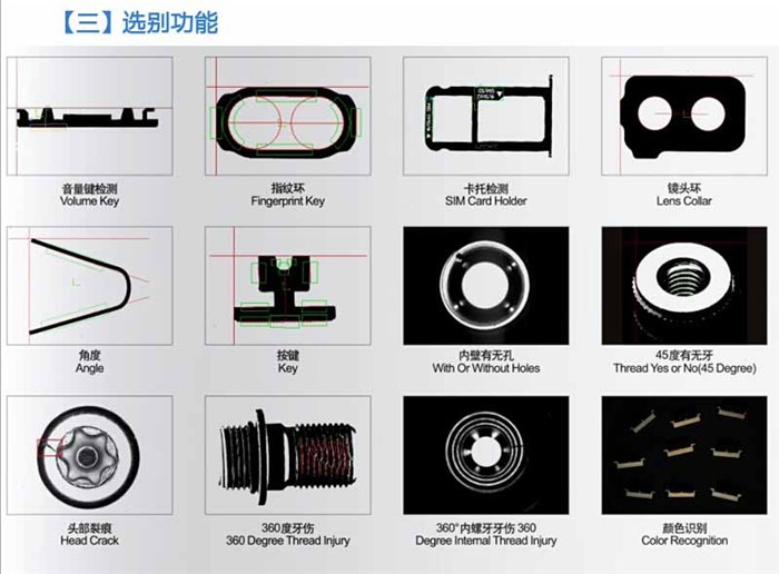 經過上面大家介紹的光學影像篩選機的功能,也隨便帶大家了解下關于光學影像篩選機可檢測功能: