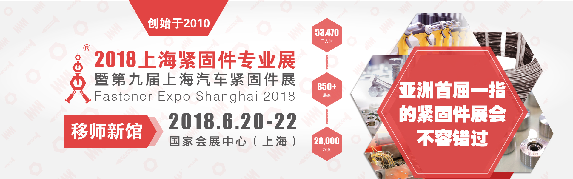 由ITE集團(tuán)分公司——艾特怡(亞洲)展覽有限公司及上海上搜展覽有限公司聯(lián)合主辦的「2018上海緊固件專 業(yè)展暨第九上海汽車緊固件展」將于2018年6月20日至22日在上海國家會(huì)展中心召開,活動(dòng)以“先進(jìn)制造”、“高新材料”、“緊扣終端”為主線引領(lǐng)緊固件行業(yè)繼續(xù)騰飛。