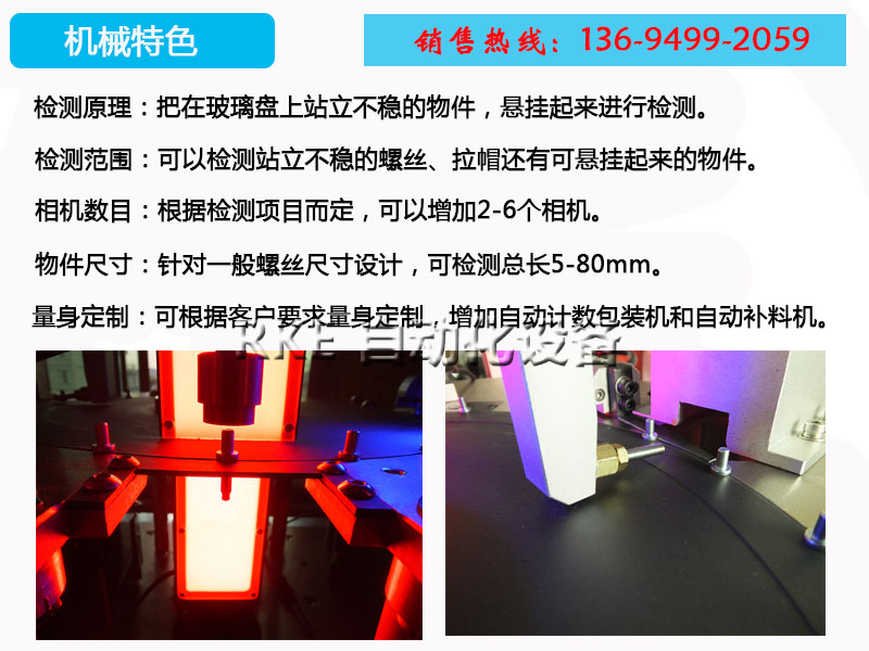 分度盤篩選設備檢測螺柱,把在玻璃盤上站立不穩的物件,懸掛起來進行檢測。檢測范圍廣,速度快,精度高